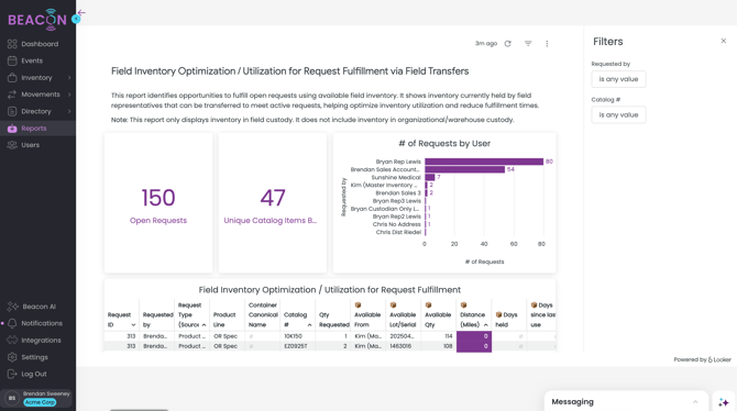 This report identifies opportunities to fulfill open requests using available field inventory. It shows inventory currently held by field representatives that can be transferred to meet active requests, helping optimize inventory utilization and reduce fulfillment times.