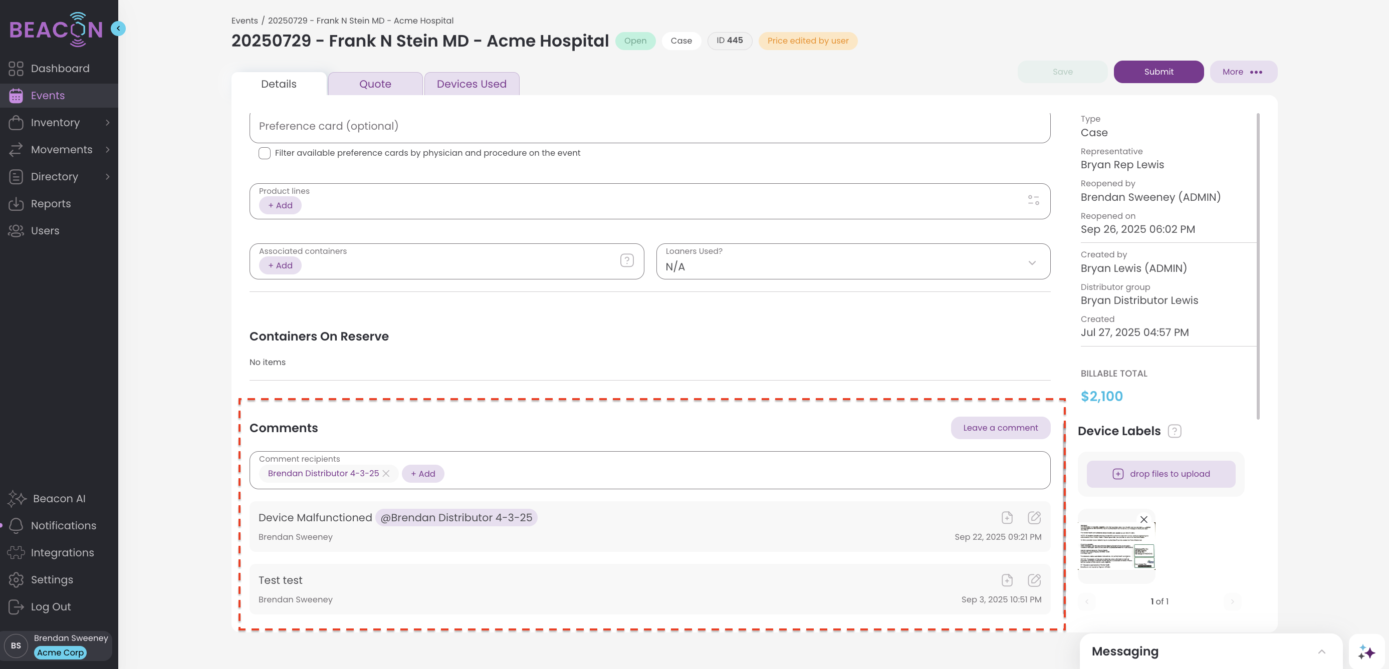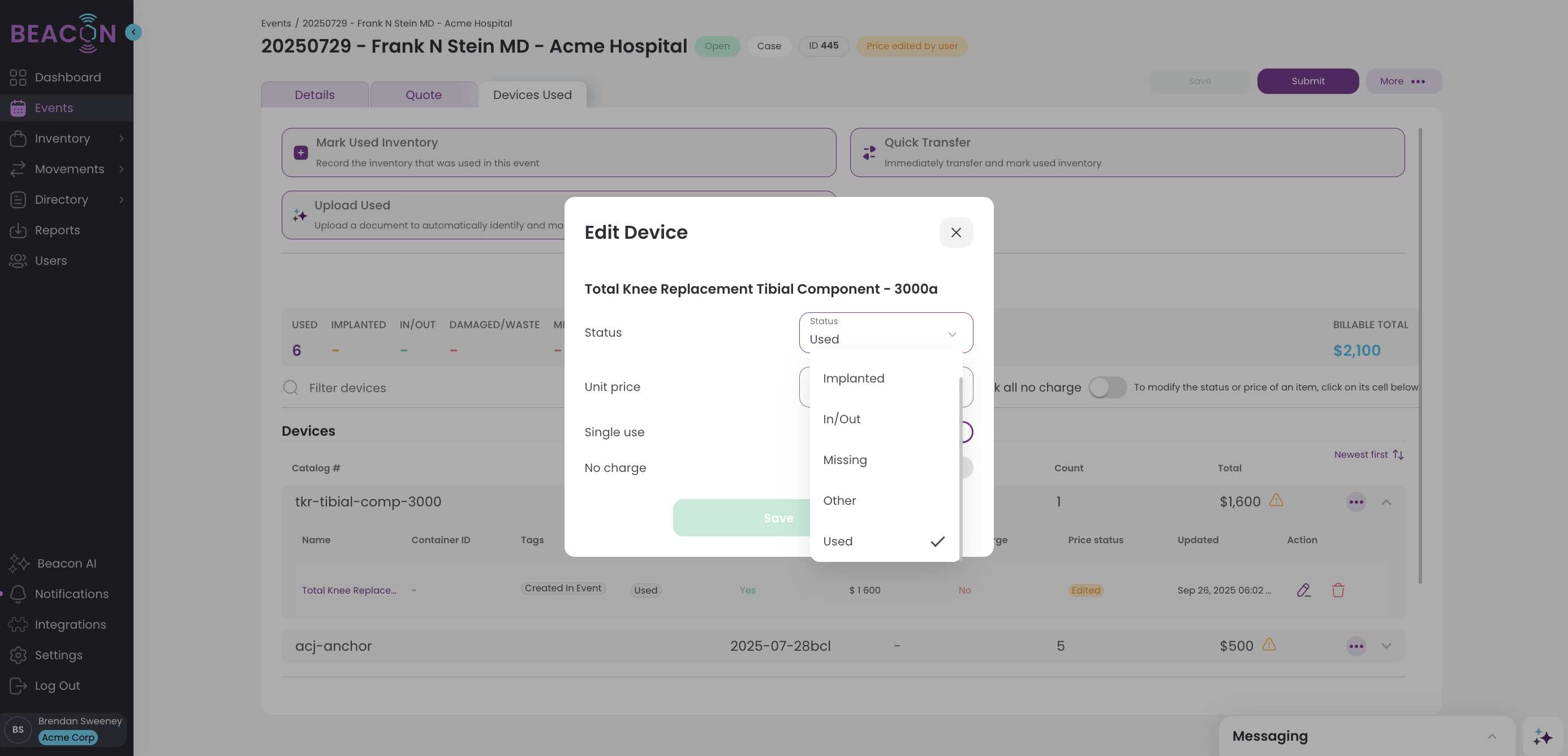 4. Mark Inventory as used as needed. Change the usage status of the individual items by clicking the pencil icon to designate if items are missing, damaged, etc and make any adjustments to the price.