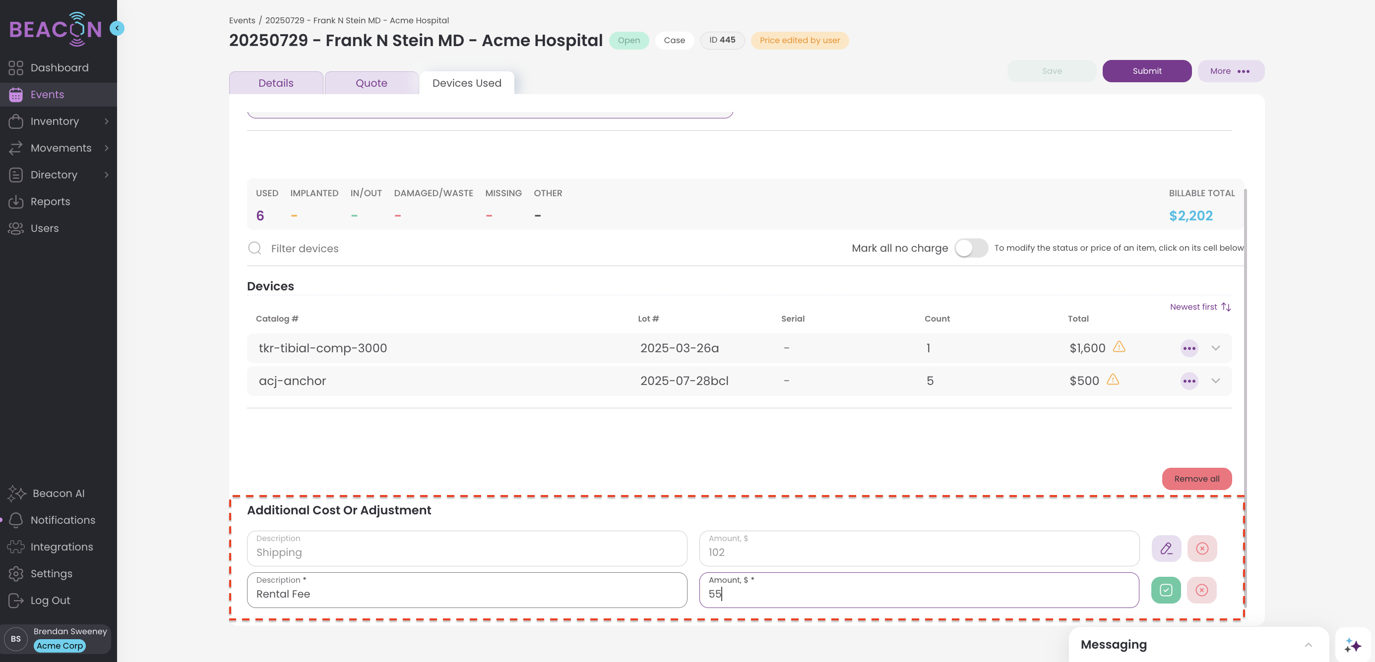 5. To add additional non-inventory line items, add "additional cost or adjustments" at the bottom of the screen. These additional line items will appear on the sales order and invoice, but will not appear in sales reporting. In the "Other" event type, you may add cost adjustments with no inventory being present, though this may not be allowed in other event types.