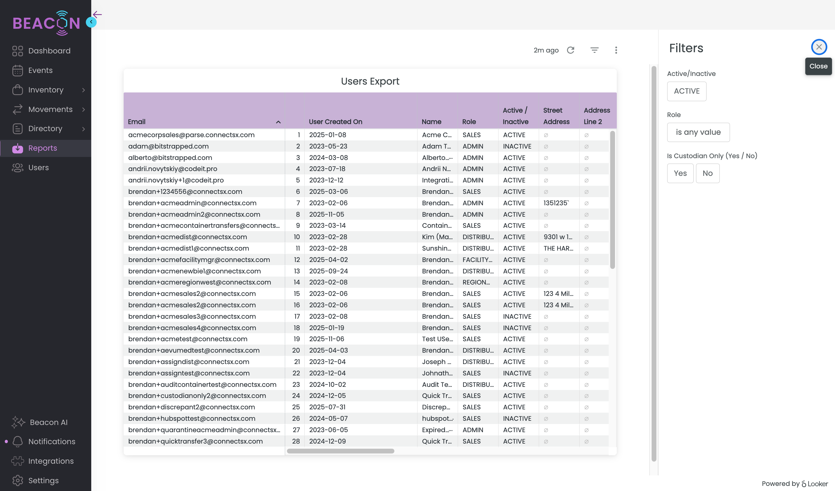The Users export includes information such as: Email, User Created On Date, Name, Role, Active/Inactive, Street Address, Address Line 2, City, State/Province, Shipping Zip, and Phone.