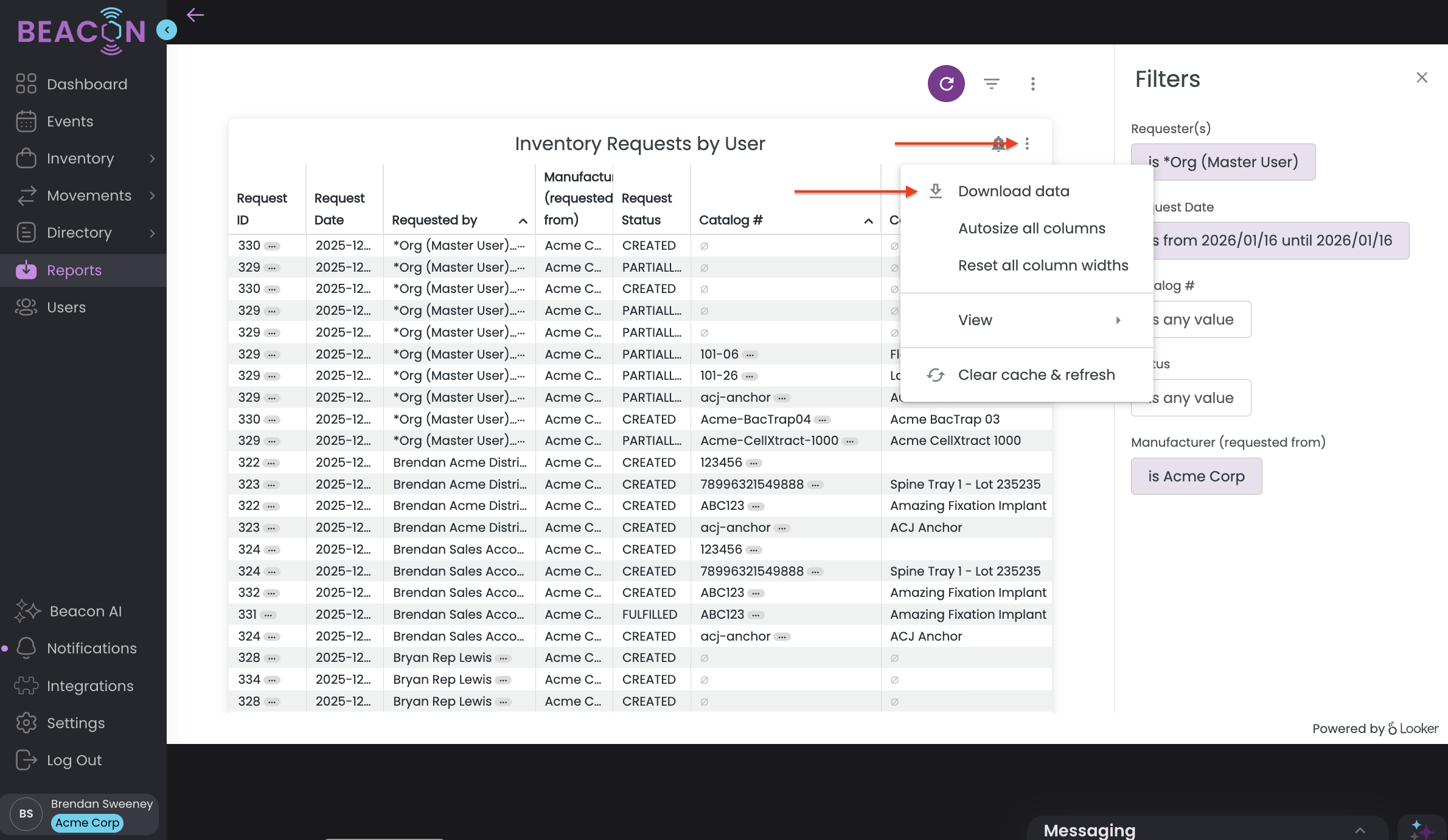 6. Export the report by clicking on the Tile Actions menu, by hovering over the top right corner of the chart. Then click "Download Data".