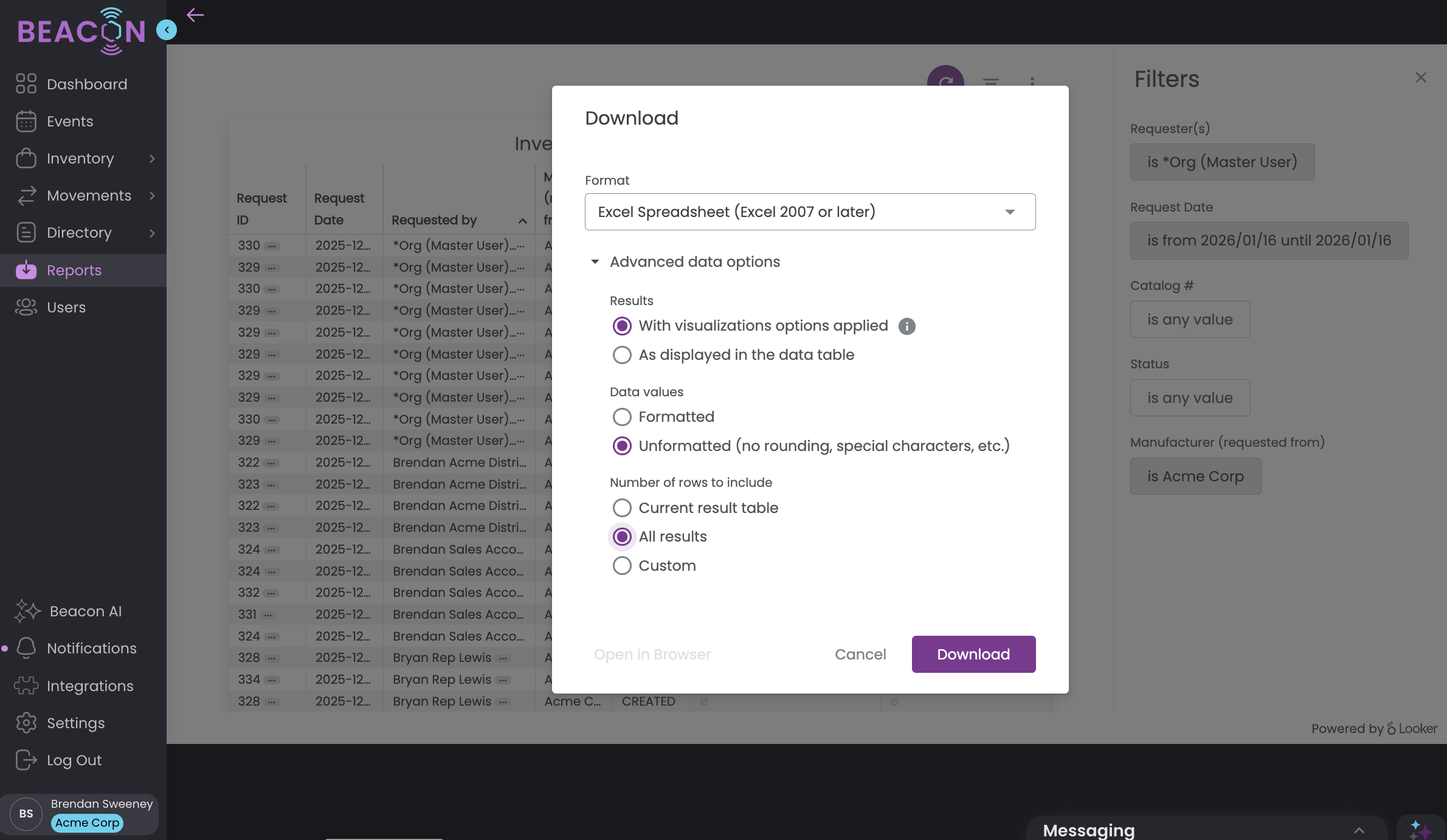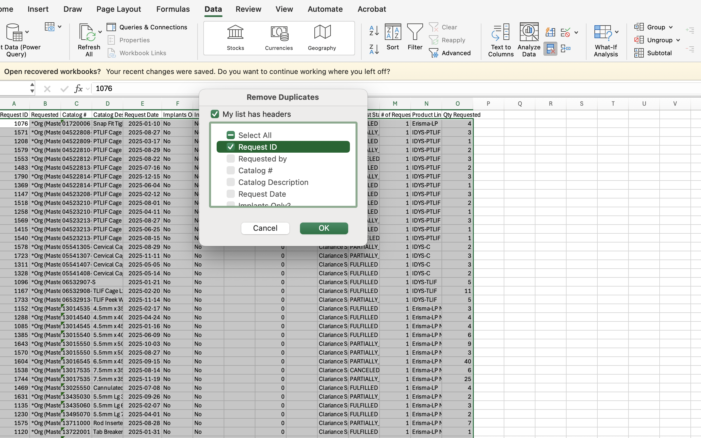 5. This report shows all of the items requested within those parameters you set, meaning each request is listed potentially multiple times (once for each item # on the request), but we can use this to get the info you're looking for. Our recommendation would be to download this report and use the "Remove Duplicates" function in Excel to narrow it down to one row per Request ID, then you can get a count of how many requests there are.