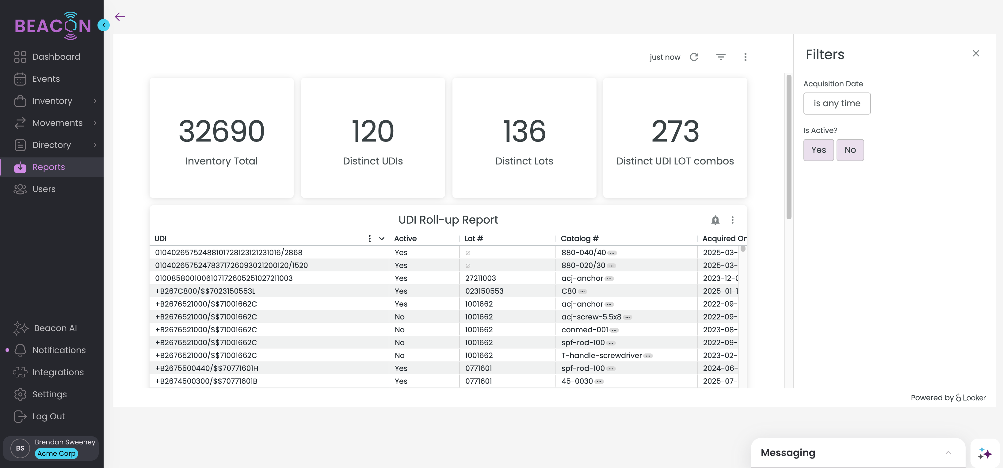 The UDI Report delivers comprehensive visibility into your unique device identifier inventory. Track total inventory quantities, distinct UDIs, lots, and UDI/LOT combinations through high-level metrics and detailed drill-downs. With both roll-up and full report views, plus filtering by acquisition date and active status, you can efficiently monitor inventory composition, identify duplicate entries, and ensure accurate device tracking across your organization.