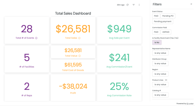The Total Sales report provides a comprehensive overview of your sales performance. At a glance, you'll see the total number and value of sales events, sales locations, and facility-specific data, along with key financial metrics such as commission and profit. This report also highlights top-selling items.