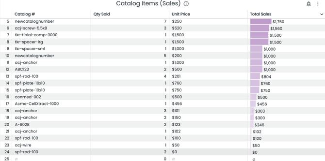 This table will provide you with unit and $ sales by item (catalog #) in the given filter range.