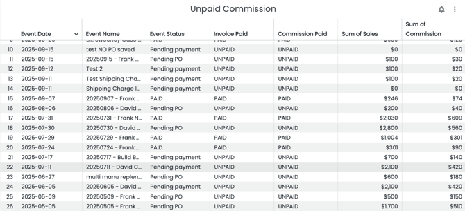 The Unpaid Commission table provides the information needed to pay out any outstanding commissions, including: Event Date, Event Name, Event Status, Invoice Paid Status, Commission Paid Status, Sum of Sales, and Sum of Commission.
