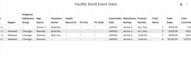 This table provides data about the Events in which Facility Stock Items were used to help you calculate the commission. It is assumed that, though the items were previously sold, that the case in which they are used may be covered by a Rep who must be paid commission on that portion of the sale.