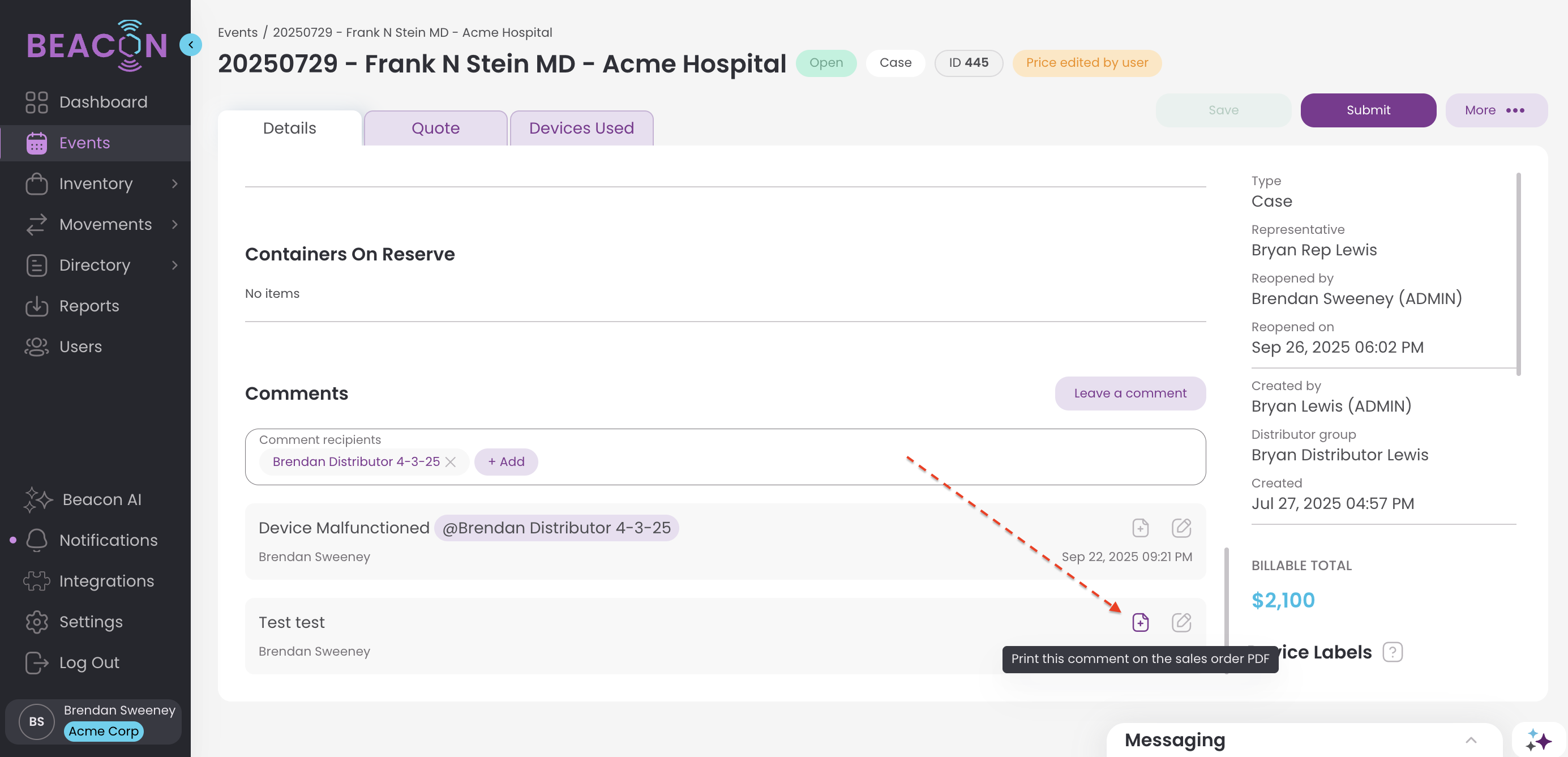 Event comments may be made at the bottom of the Event Detail screen and printed on the sales order.