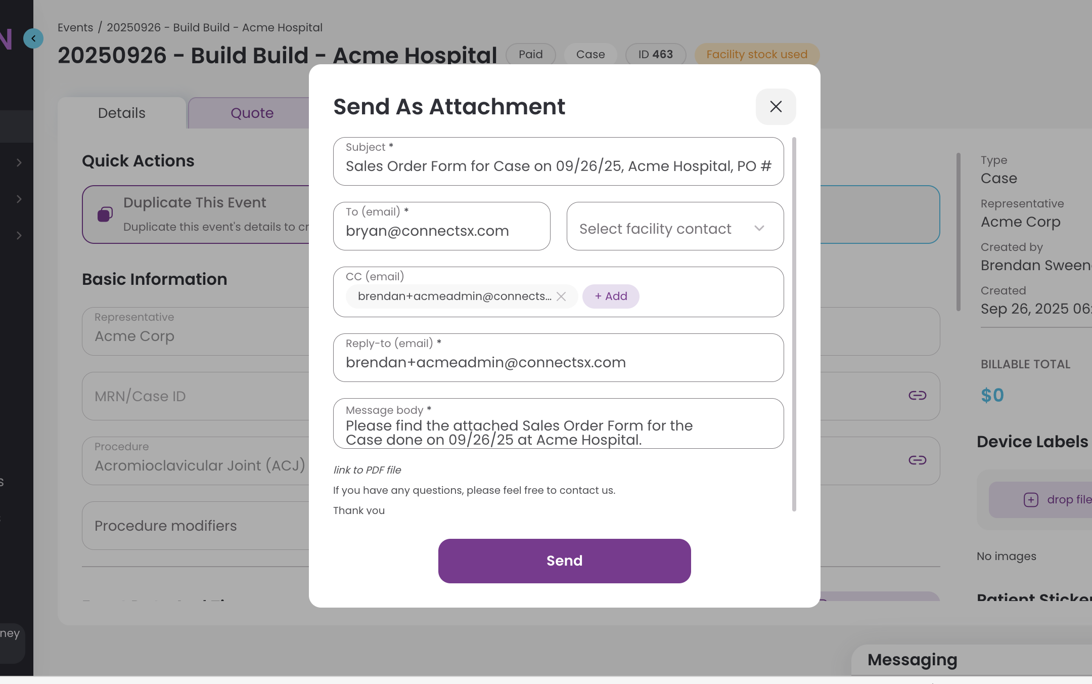 All fields of the attachment email sent to the facilities containing the Sales Order or Invoice are editable. So you may leave any instructions or special communications in the body of the email when you send it.