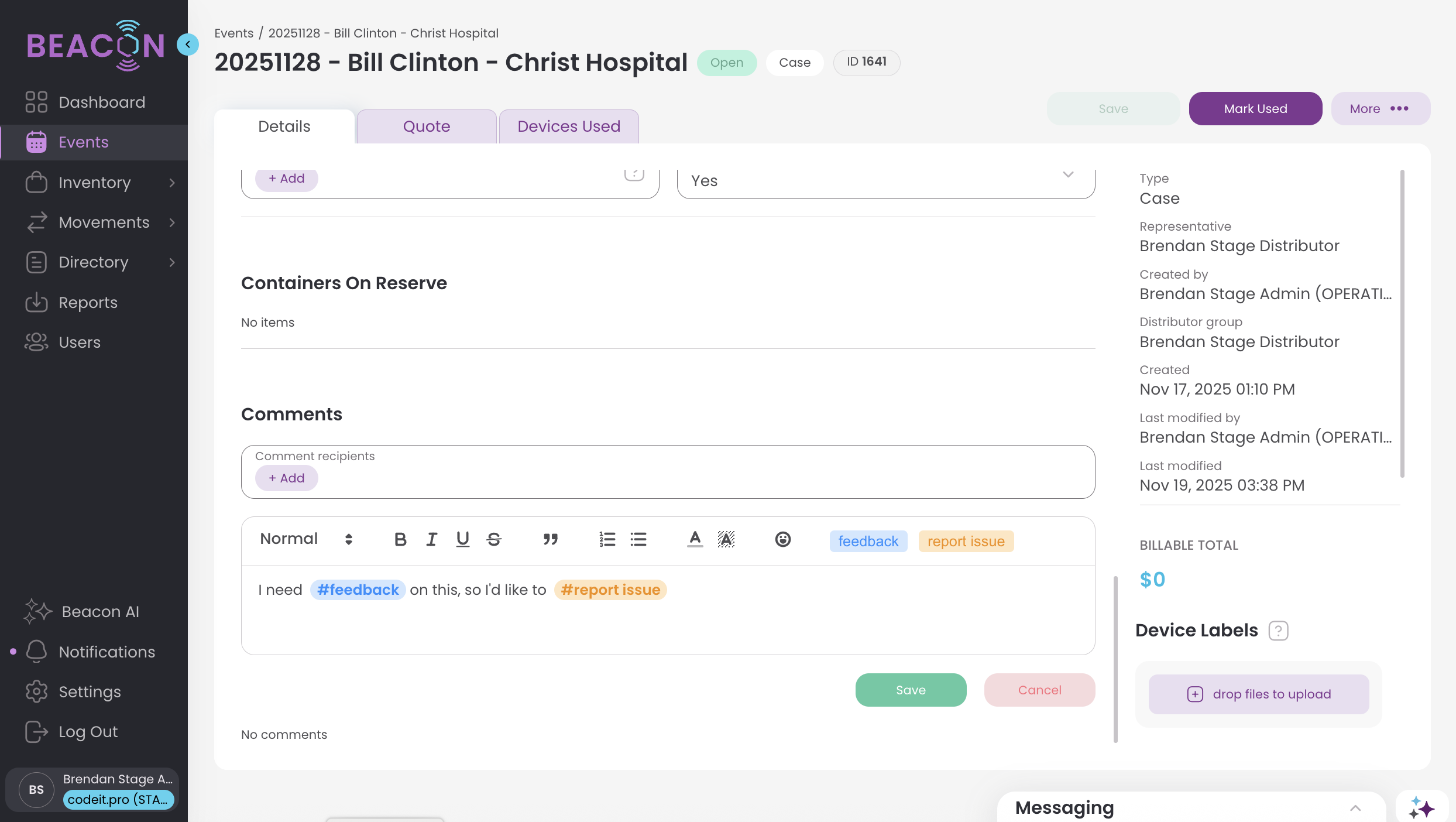 Why not comment on Events, Transfers, Requests, Devices, etc. to communicate with your team, within the context that you're messaging about. These communications can be directed to a specific person, users will receive notifications when someone is messaging them, they can even be a watcher on a case to get updates on any comments; the best part is that these comments are saved as an enduring record of these case communications for future reference.
