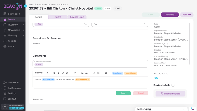 The comments sections throughout ConnectSx allow you to message your team with enduring updates in-context of the event, request, transfer etc. that the comment applies to.