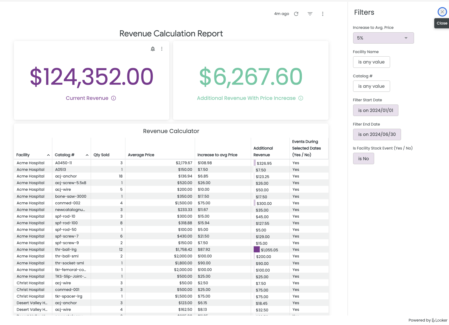 The report will display the calculated revenue by item with the applied price increase including: Facility, Catalog #, Qty Sold, Average Price, Increase to Average Price, Additional Revenue, and Events During Selected Dates (Yes/No).
