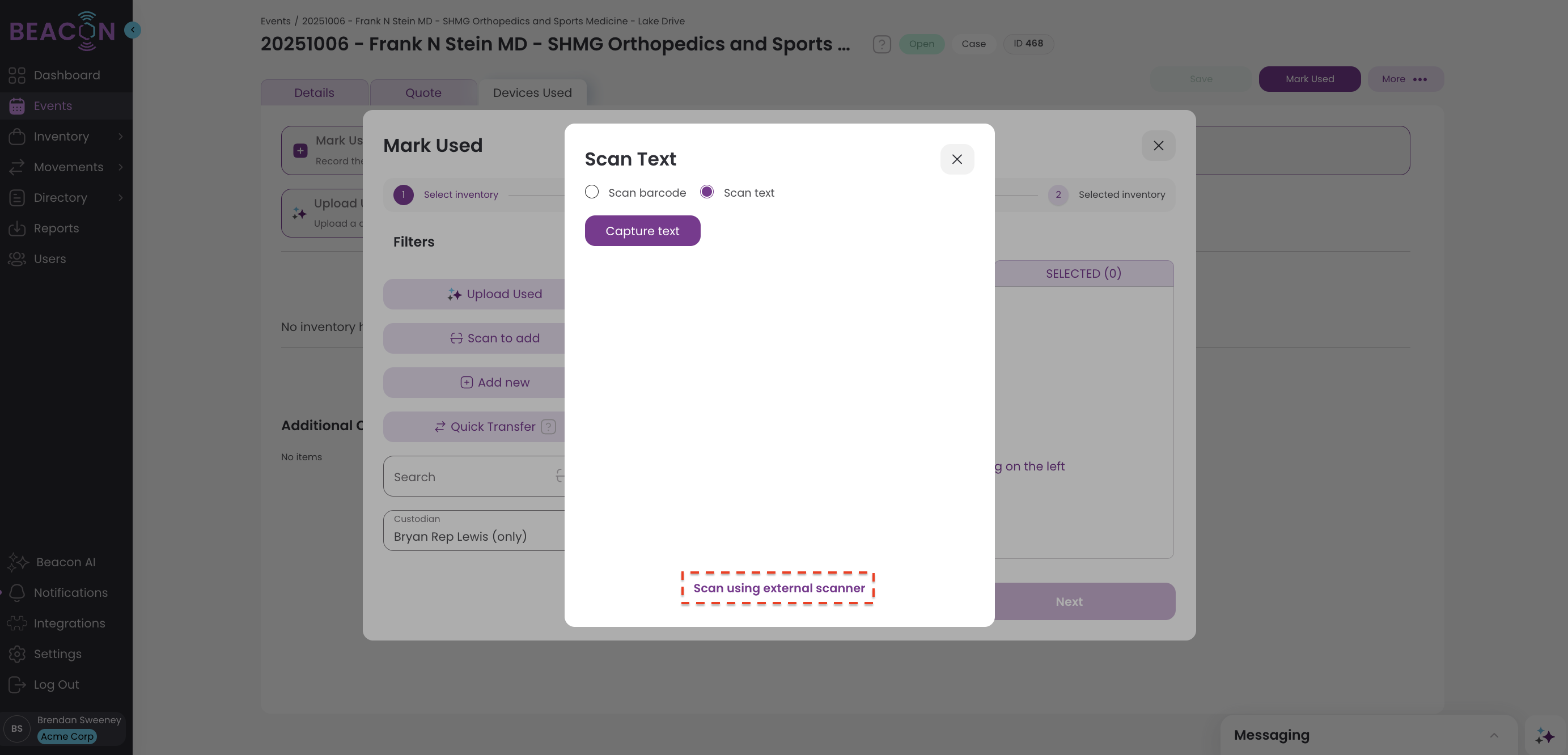 Beacon allows you to scan barcodes using the camera on your device(s), but you can also utilize external scanners.