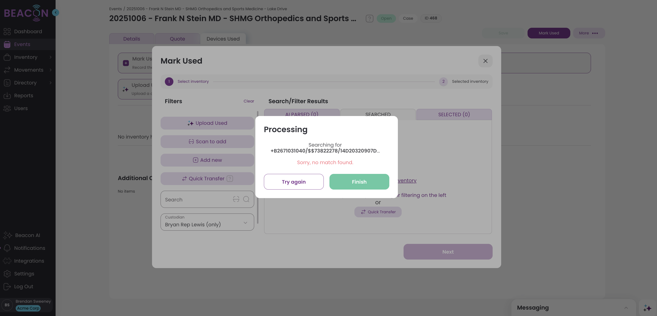 6. When the app receives the barcode data it will search your inventory for matching UDIs