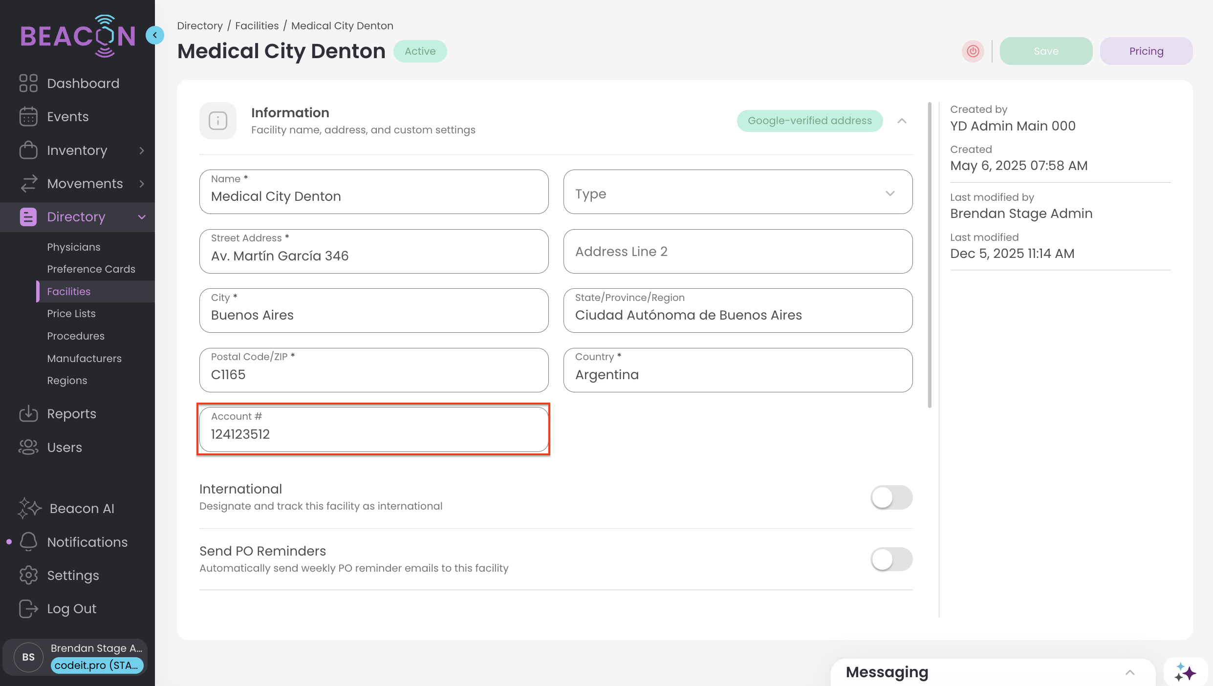 - After the Facility has been created, review the details in the Facility detail screen. You may also add contract pricing for this facility.