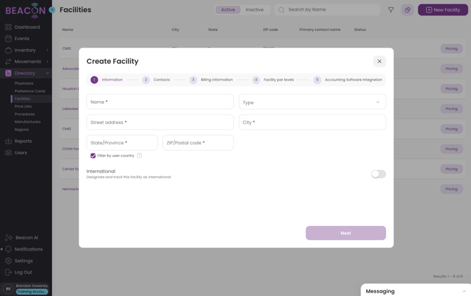 - Fill in the Name and relevant contact information for the Facility. After you have entered the information for a section, click the "Next" button to proceed to the next section.
