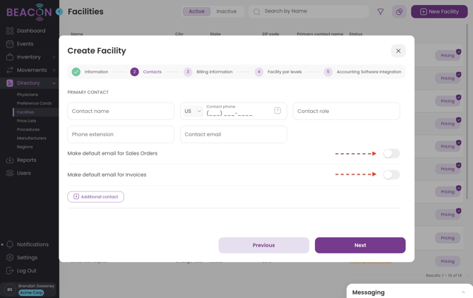 - The Billing contact will be the default primary contact used for sending sales orders or invoices, but you may designate the appropriate contact as well if you prefer to use a different contact, just flip the toggle next to that option for that contact.
