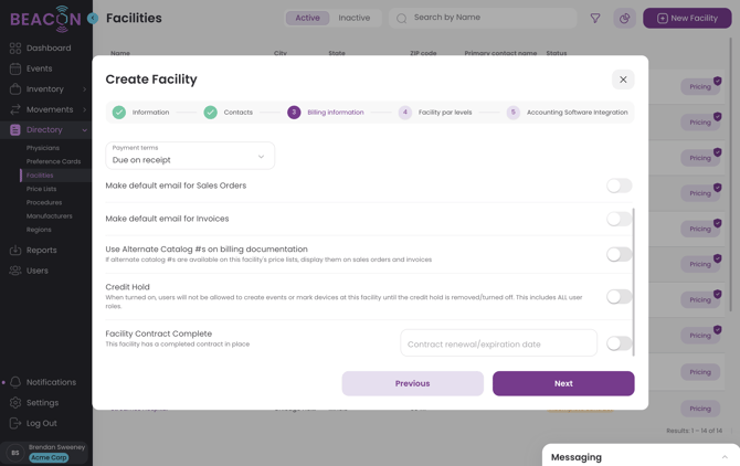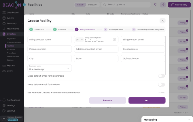 - If you have an account number for a facility related to your accounting system, enter that here. This will appear in the "Billed To" section of the Sales Order for cases at this Facility.