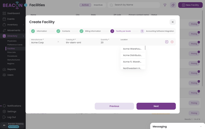 - Feel free to add Facility Par Levels at this time, thought they can also be created later. Click on the "+" button to add a new par level for an item at this facility.