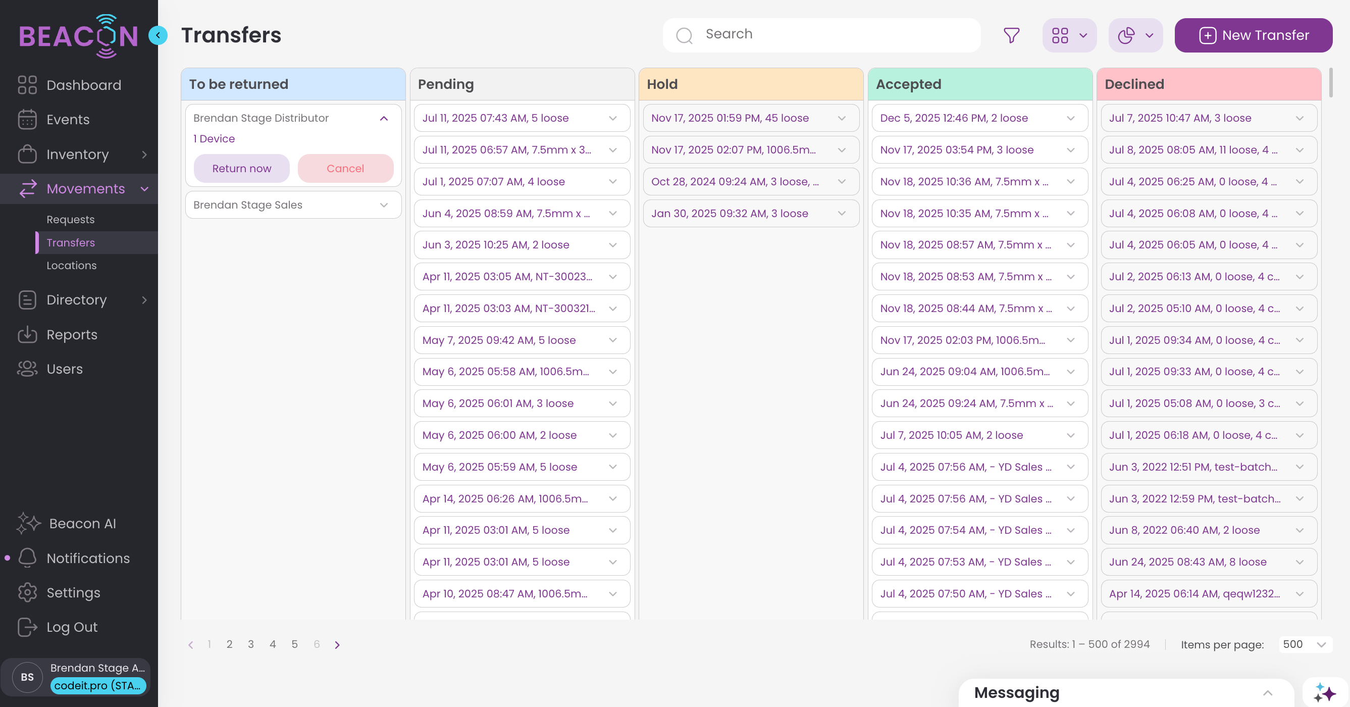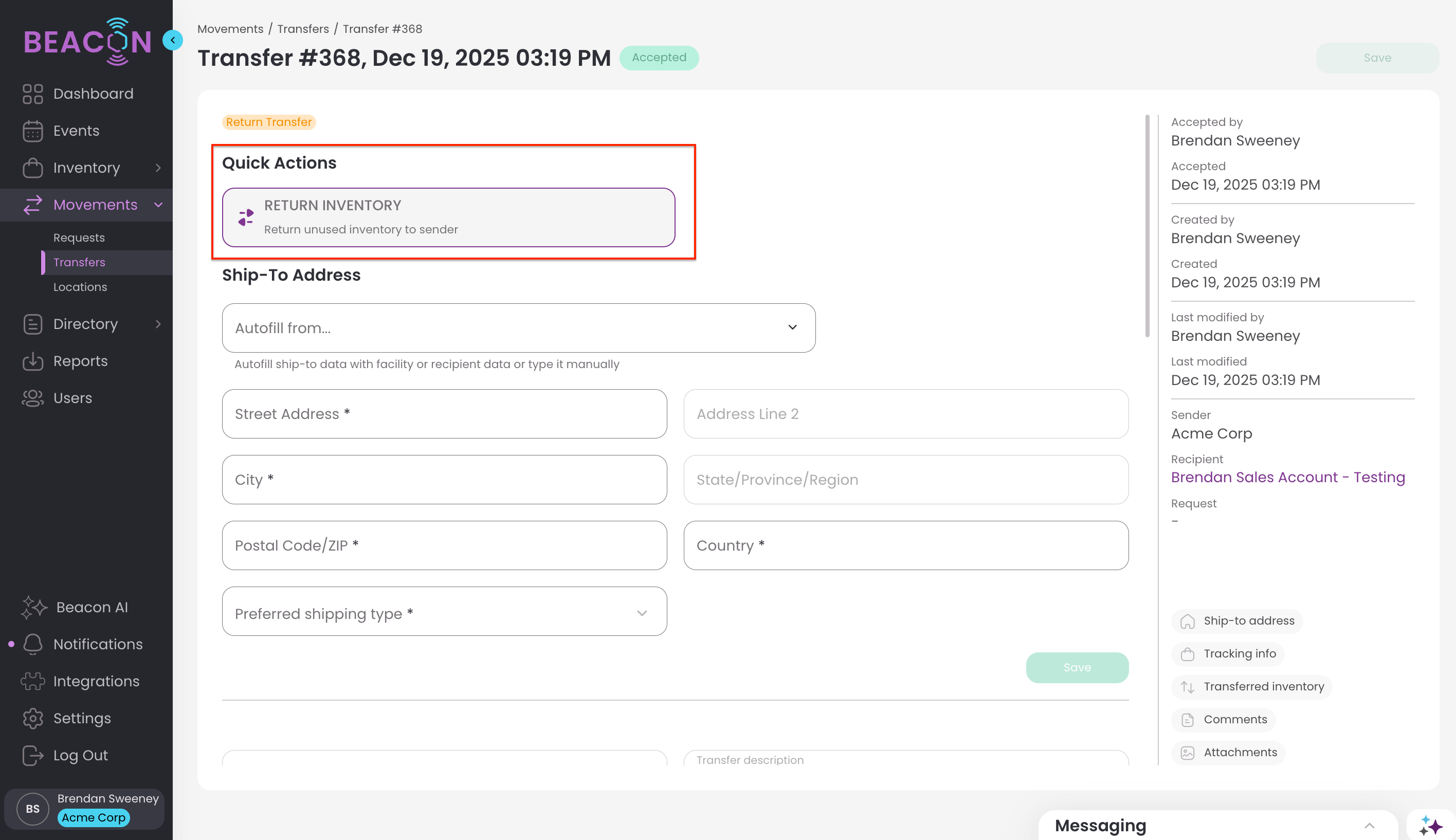 Returning your loaned inventory is as easy as creating a transfer back to your organization of the items to be returned.