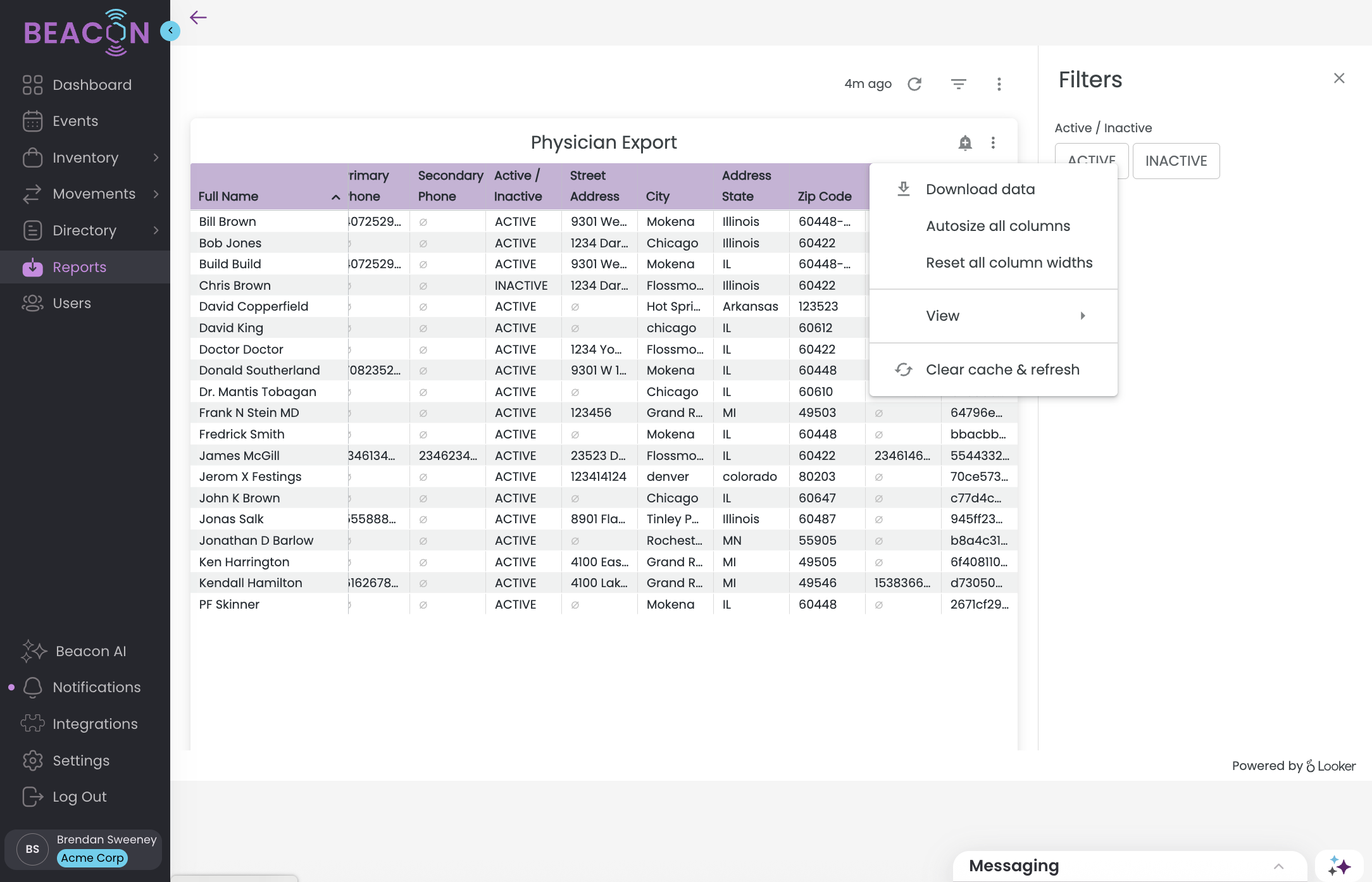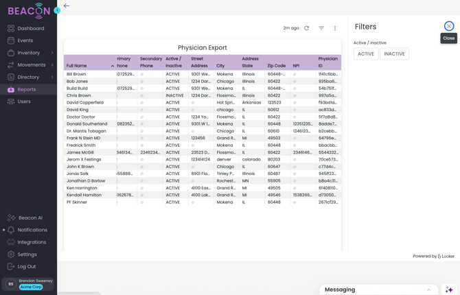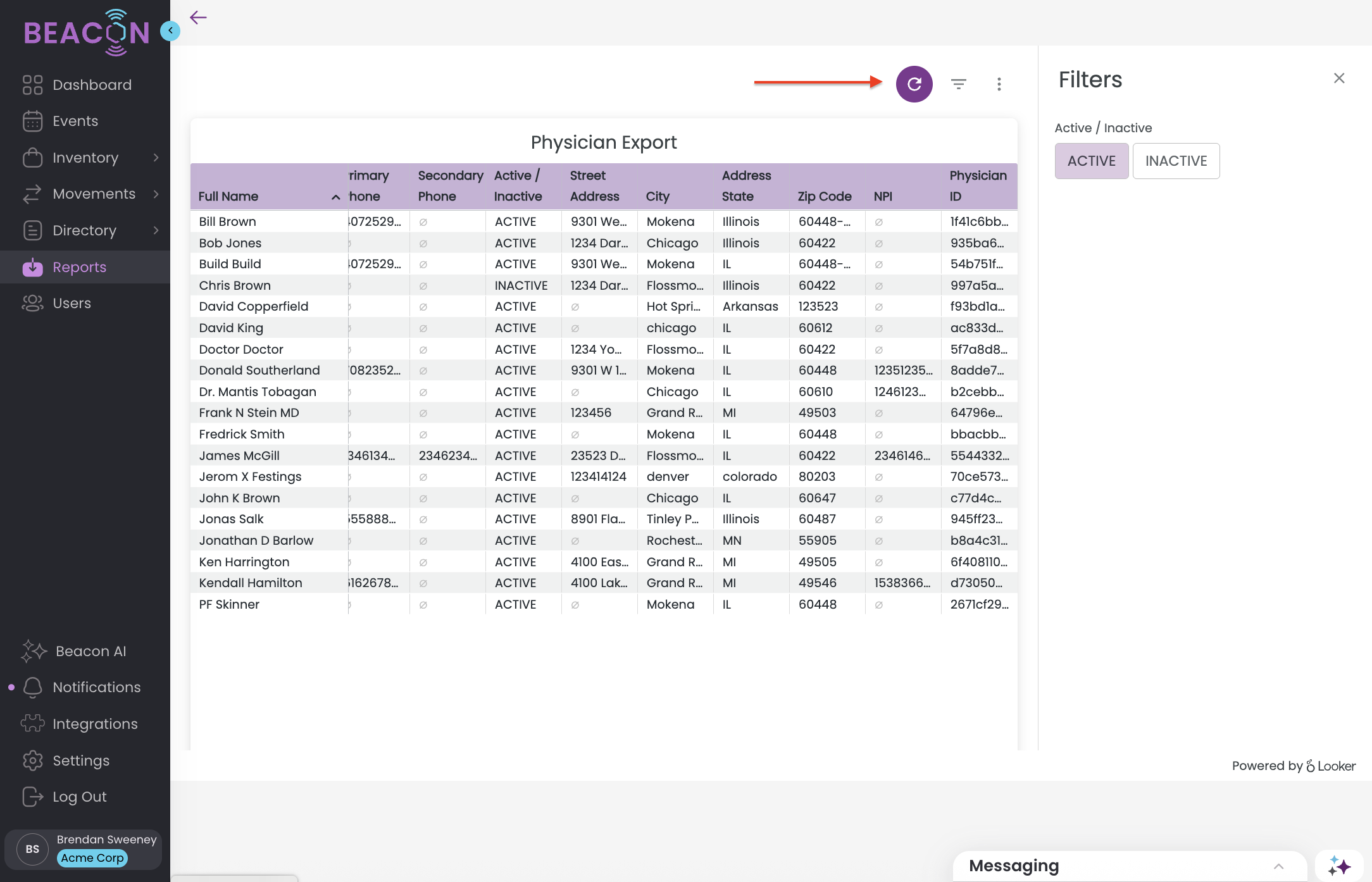 The Physicians export includes: Full Name, First Name, Middle Name, Last Name, Email, Primary Phone, Secondary Phone, Active/Inactive, Street Address, city, Address State, Zip Code, NPI, Physician ID.