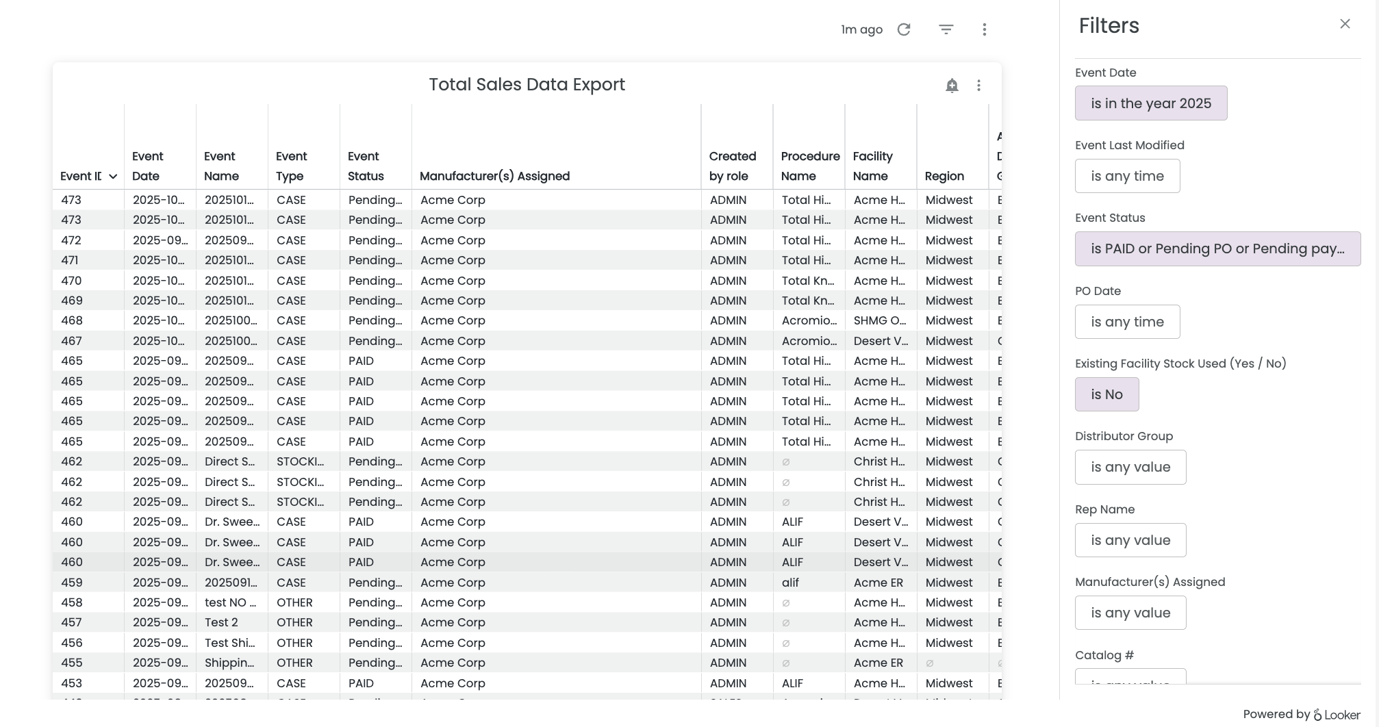 The Total Sales Data Export report will provide you with a list of all of your sales in the given range including: Event Id, Event Date, Event Name, Event Type, Event Status, Manufacturer(s) Assigned, Created by Role, Procedure Name, Facility Name, Region, Assigned Distributor Group, Rep Name, Physician Name, MRN/Case ID, Total Items, PO Numbers, PO Date, Total Sales (Calc), Total Commission, Commission Paid Status, Total Cost of Goods, Producct Line, Catalog #, Lot #, Invoice Paid Status, Invoice Email Date(s), Total Additional cost Adjustments, Event Last Modified Date.