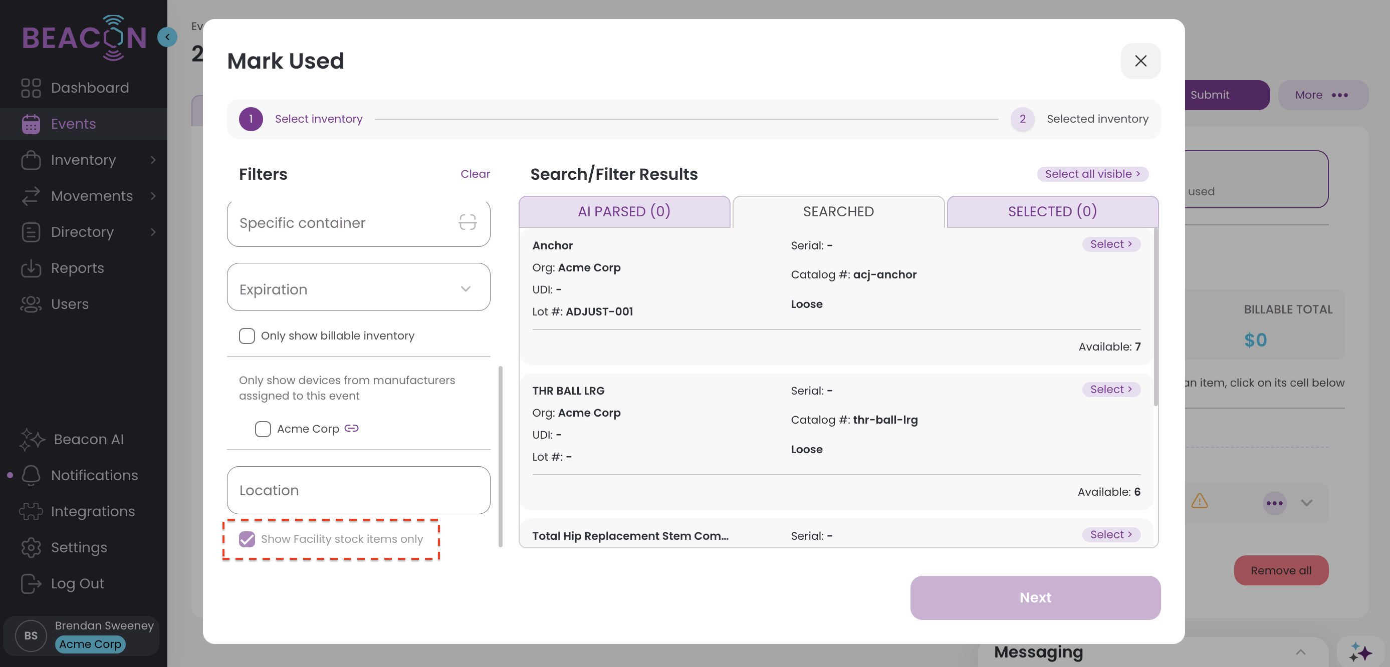 When they get to the step for “Mark Used Inventory”, however, they should check the box in Filters for “Show Facility Stock items only”. This will allow the user to select from the items previously sold in a Stocking Order to the facility. Note: Facility Stock cannot be entered in a case with other unsold, rep-consigned inventory.