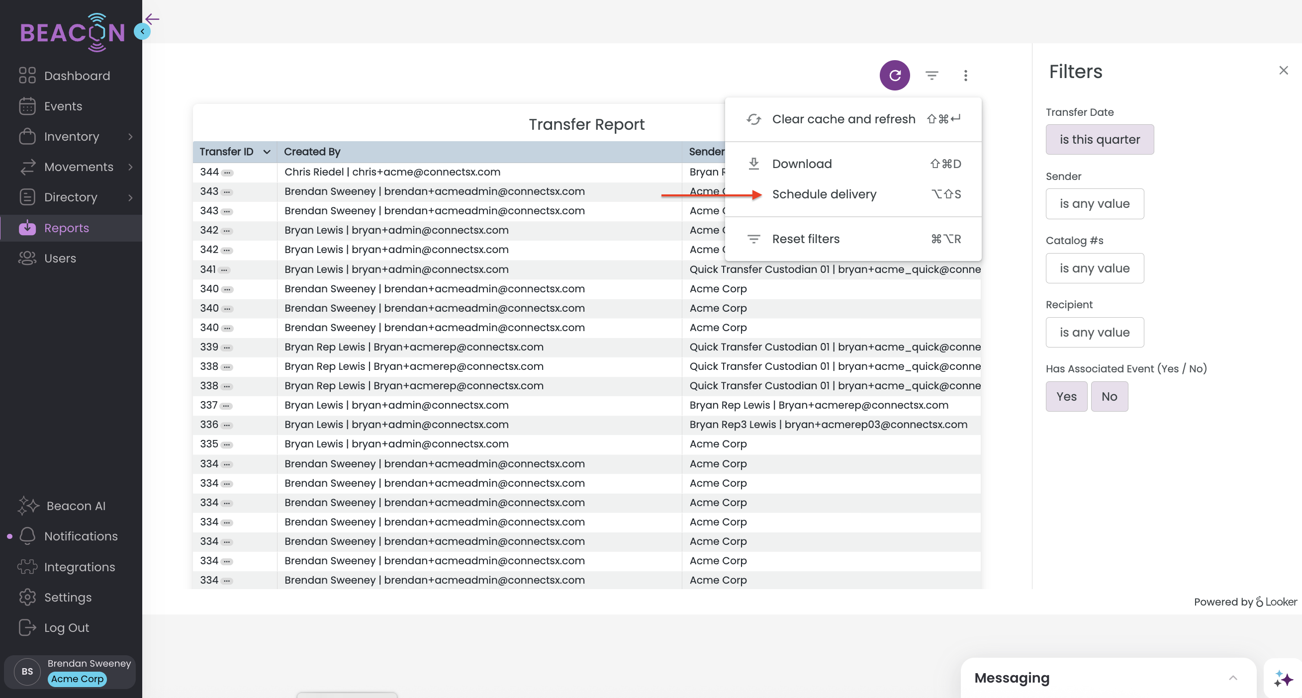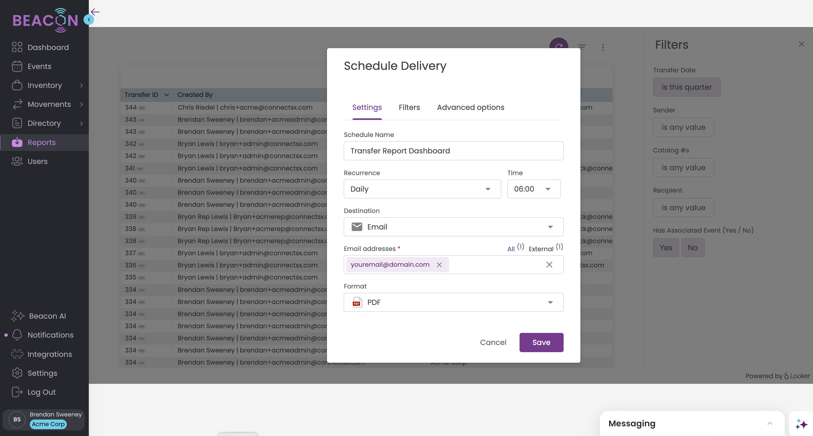 Beacon allows you to set up report jobs to send to your email at regular intervals. You may: