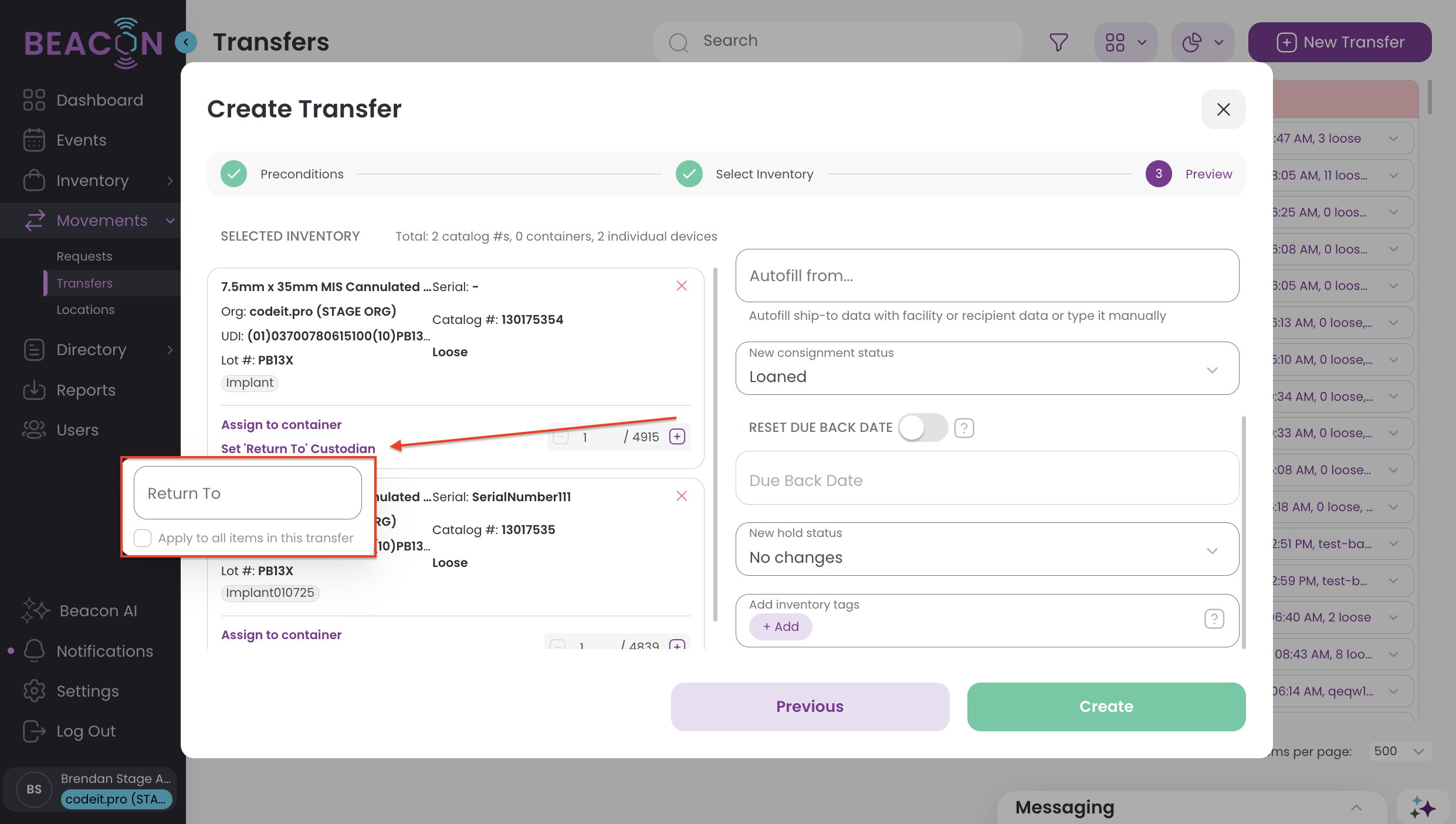 - You may also designate a return custodian for inventory transfers that are marked with a consignment status of Loaned. Click on the "Set Return to Custodian" link on each item to select the return custodian from the dropdown menu. Click the checkbox to apply to the rest of the transfer if appropriate.