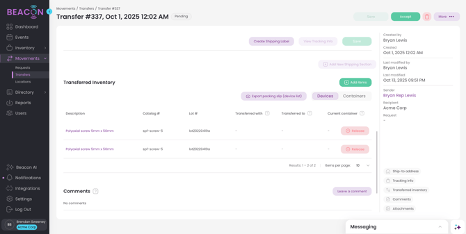 Note: Generally, we recommend that you only accept a transfer once you have received the physical inventory, as the system will consider you to have custody of and responsibility for those items.