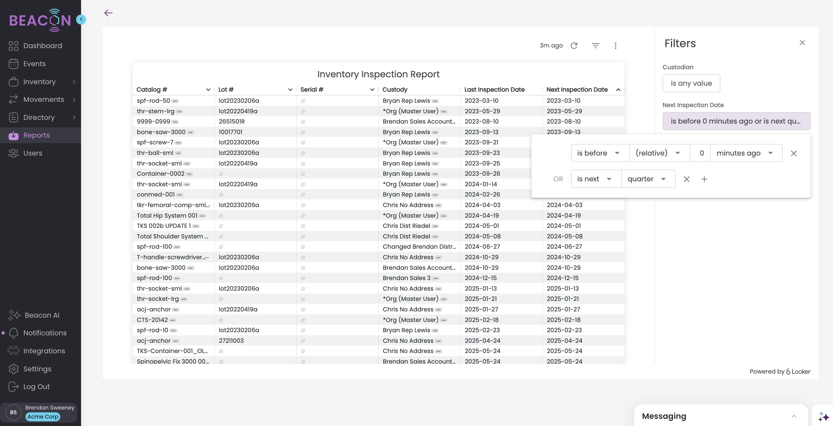 The Inventory Inspection Report displays all inventory items that require inspection, showing catalog details, lot and serial numbers, custodian information, and inspection schedules.