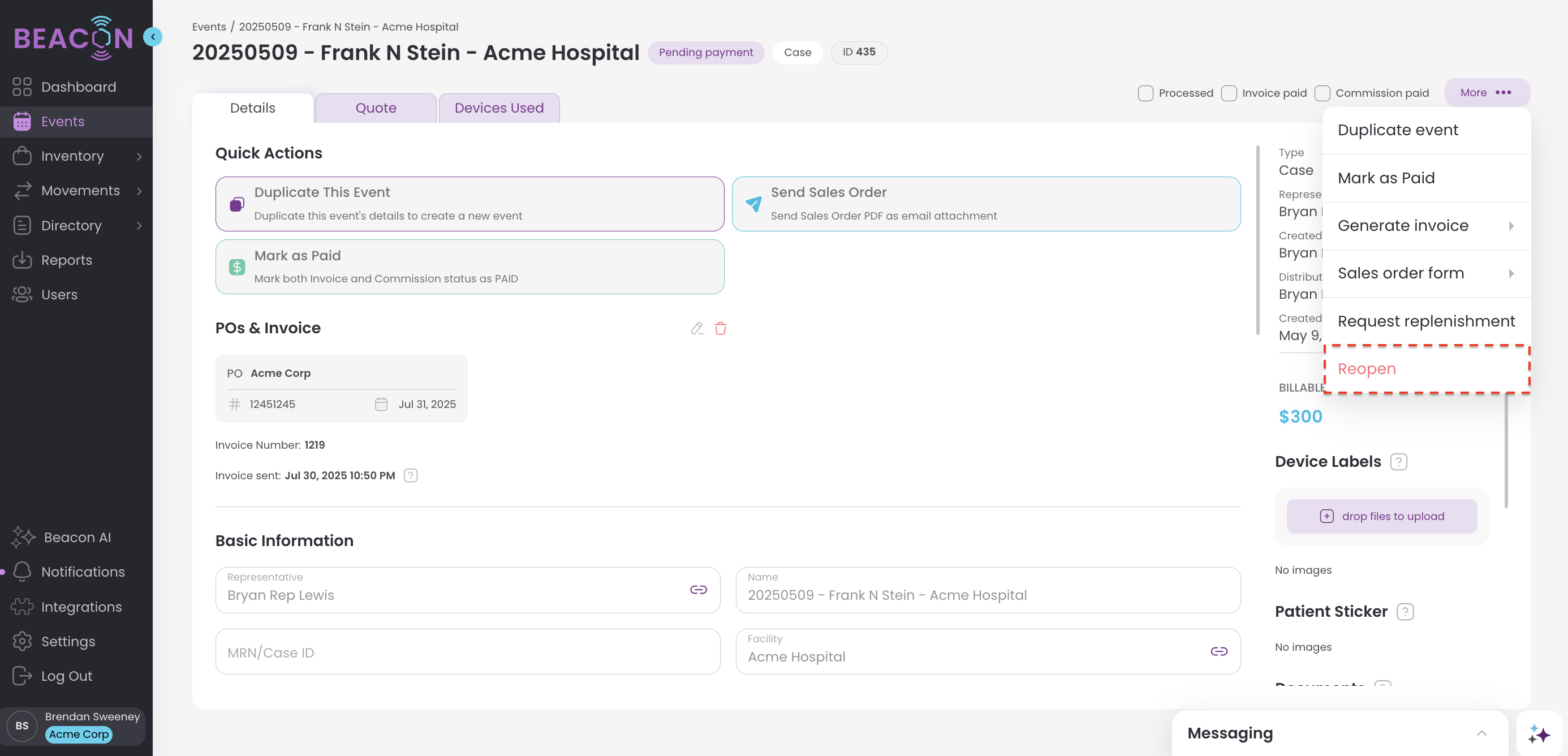 1. If your event is no long in an Open status, then click on the More menu to reopen it. This will return the event to an Open status.
