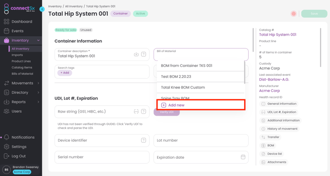 If you are in the container detail screen and are looking to create a new BOM to associate with that container, you may notice that in the Bill of Materials dropdown menu there is a “Add New” button which allows you to create a new Bill of Materials directly from the Container’s Detail Screen. However, there is a known issue you should be aware of.